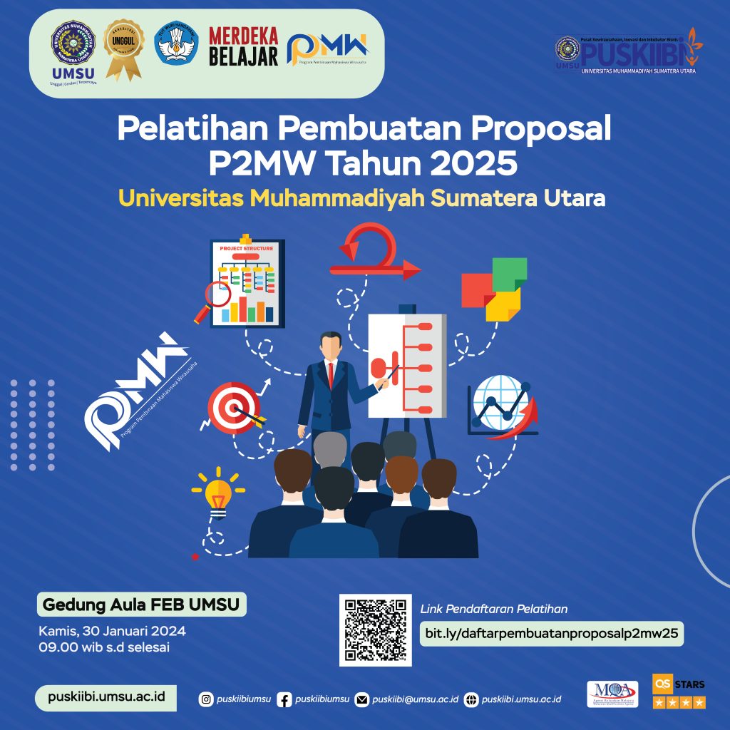 Kegiatan ini akan dilaksanakan pada 30 Januari 2025 di Aula FEB UMSU. Kegiatan pelatihan pembuatan proposal ini merupakan kegiatan reguler yang diadakan puskiibi dalam rangka membantu para mahasiswa umsu untuk mengembangkan minat wirausaha, mempersiapkan uji kompetensi kewirausahaan dan mempersiapkan lomba P2MW.